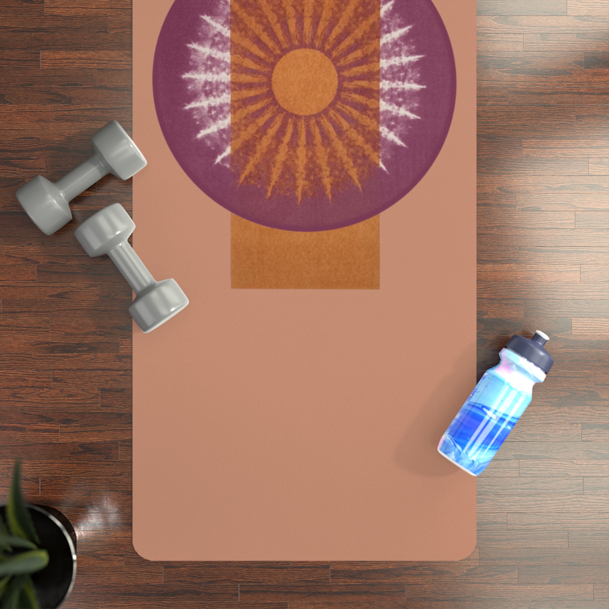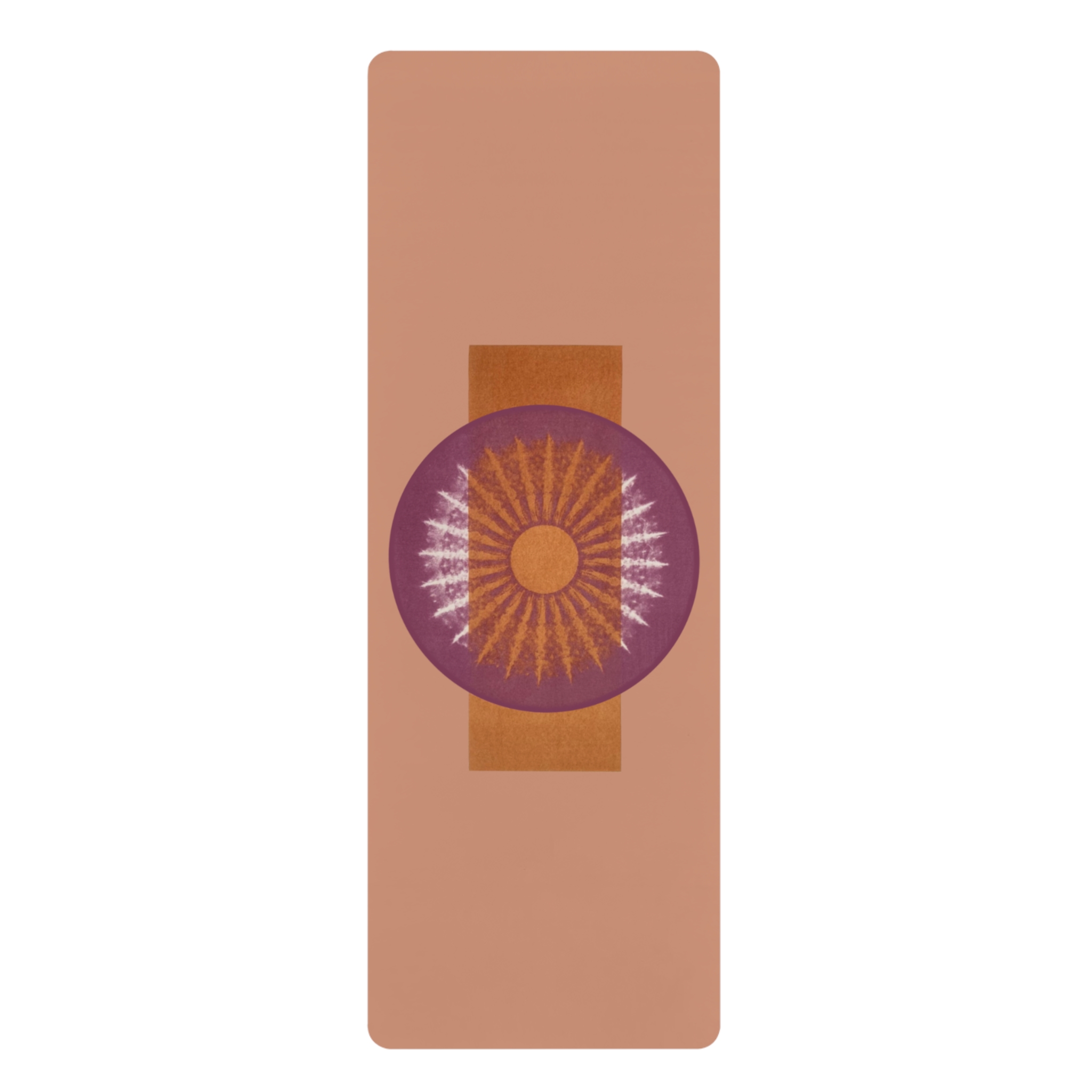 Sink into a quiet practice with this lightweight rubber yoga mat that feels like a private sunrise beneath your feet. The microfiber suede top offers a soft, grippy surface while the natural rubber base and anti-slip backing keep every pose steady. Warm terracotta tones and a centered sun-inspired motif create a calming focal point for breath work and balance. Roll it up with the included black polyester strap and take your flow to the park, studio, or living room. Care for color vibrancy by keeping it out of direct sun.